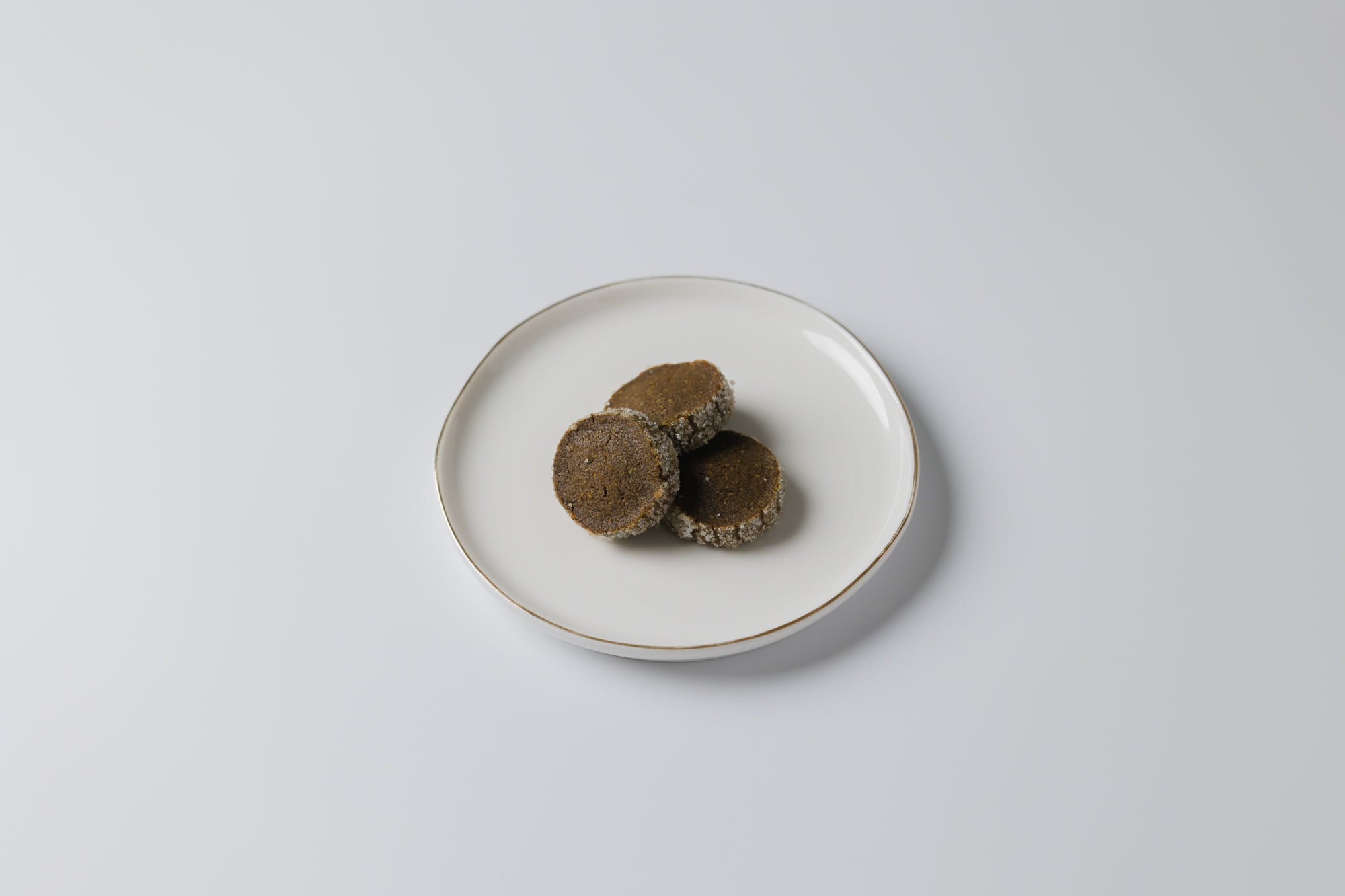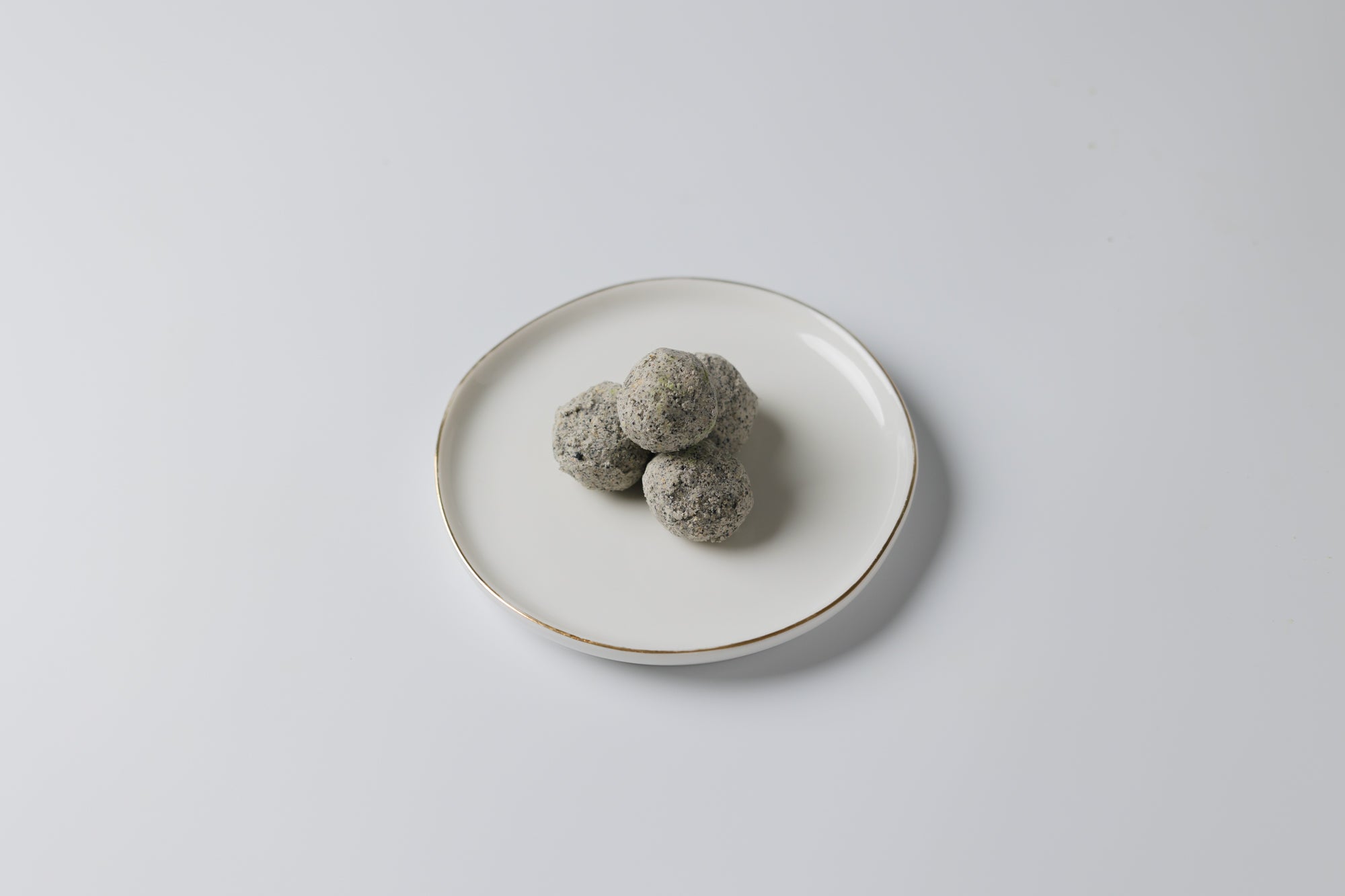 生地に黒ごまを挽いたものをたっぷりと練り込みました。外側には和三盆と共に挽いた黒ごまをまぶしました。ごまの香ばしさと和三盆の上品な甘さが絶妙にマッチして、ひと口食べると止まらない美味しさです。
